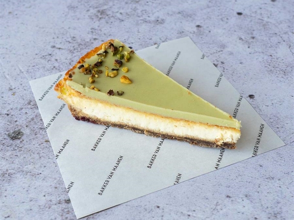 Romige cheesecake met een smaakvolle koekbodem, afgewerkt met pistache creme en pistache nootjes
